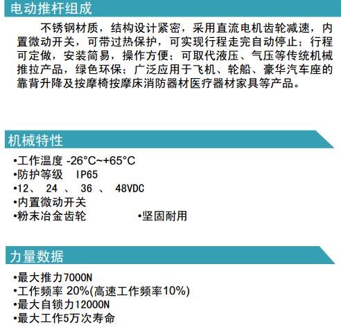 不銹鋼材質(zhì),結(jié)構(gòu)設(shè)計(jì)緊密,采用直流電機(jī)齒輪減速,內(nèi)置微動(dòng)開關(guān),可帶過熱保護(hù),可實(shí)現(xiàn)行程走完自動(dòng)停止;行程可定做,安裝簡易,操作方便;可取代液壓、氣壓等傳統(tǒng)機(jī)械推拉產(chǎn)品,綠色環(huán)保;廣泛應(yīng)用于飛機(jī)、輪船、豪華汽車座的靠背升降及按摩椅按摩床消防器材醫(yī)療器材家具等產(chǎn)品。