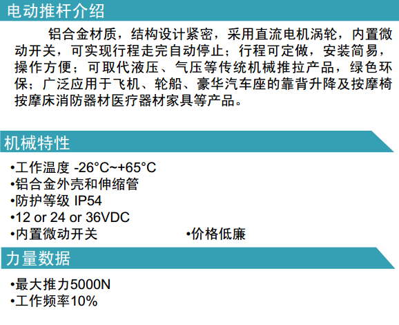 鋁合金材質(zhì),結(jié)構(gòu)設(shè)計緊密,采用直流電機渦輪,內(nèi)置微動開關(guān),可實現(xiàn)行程走完自動停止;行程可定做,安裝簡易,操作方便;可取代液壓、氣壓等傳統(tǒng)機械推拉產(chǎn)品,綠色環(huán)保;廣泛應(yīng)用于飛機、輪船、豪華汽車座的靠背升降及按摩椅按摩床消防器材醫(yī)療器材家具等產(chǎn)品。