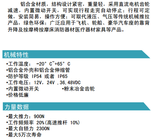 鋁合金材質(zhì),結(jié)構(gòu)設(shè)計(jì)緊密,重量輕,采用直流電機(jī)齒輪 減速,內(nèi)置微動開關(guān),可實(shí)現(xiàn)行程走完自動停止;